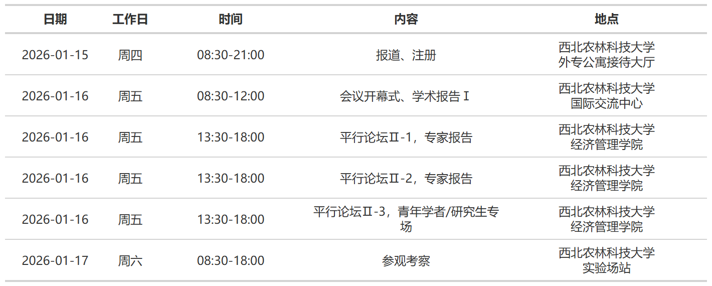 2026年1月15日(周四):参会报到(报到地点:西北农林科技大学外国专家公寓,8:30-21:00)。
